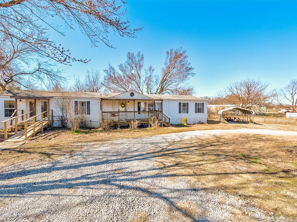 Manufactured home on 1/2 acre lot. Remodeled kitchen with new cabinets and fresh paint. Laminate wood flooring. Additional living room added with closet and wheelchair ramp entry. Master bedroom with large walk-in closet, private bath with garden tub and separate shower. Covered front porch and covered back deck. Fully fenced yard, circle drive, and storage shed. Above ground pool and all equipment will remain. Close to Hwy 75 for easy travel to Tulsa and Bartlesville.