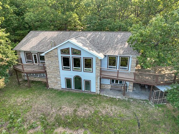 This amazing lake front home has no neighbors within view and the closest road access to Starkey Marina! 5+ acres with no restrictions (except for no mobile homes or RV use), allow you to do whatever you want with the property including commercial use! 317’ of lake frontage located in an awesome cove nicknamed “Eagle Cove” because of the year round bald eagles and their nest! The impressively huge view strikes you immediately when you walk through the front door, and allows you to watch boats all day and 4th of July fireworks over the lake! This very spacious home has a warm feel to it and the five decks and patios allow you to soak up all of the nature you want. Custom woodwork and tile throughout the home and radiant in-floor heat in the lower level. Low-E windows and overly insulated walls/ceiling combine for very low utility bills. New HVAC, boiler system, and roof within the last 3 years. The large shop is located a short walk from the house and has a huge number of possibilities for your hobbies or business!