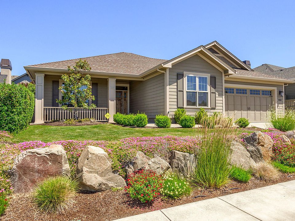 LIKE NEW, single level Mahar built home in the Summerfield area! Lovely VIEWS of the foothills in the distance from the front windows and porch. You will love the wonderful open floorplan! The primary and 2nd and 3rd bedrooms are separated for privacy. High-end features throughout: ''character'' white oak wide planked flooring, alder cabinetry, quartz countertops in the kitchen and tile in the bathrooms, solid interior doors, dramatic stone and tile faced gas fireplace with an alder mantle and soaring vaulted ceiling in the living room, and much more. The spacious primary bedroom suite includes a beautiful bathroom with an amazing step-in tile shower, double sinks, and bronze fixtures. Lots of windows and light in this home. The backyard is just the right size and offers a feeling of solitude—the perfect place to relax.