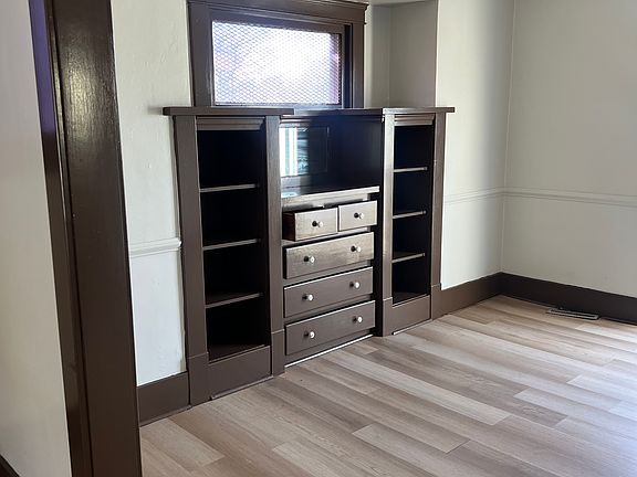 The house features natural woodwork throughout the property, newer carpet, oak built-in cabinets, nice kitchen cabinets, eating area in kitchen, fire place, full basement with an additional toilet and shower. Spacious backyard, partial fenced yard and nice deck in the back of the property that's great for gatherings.