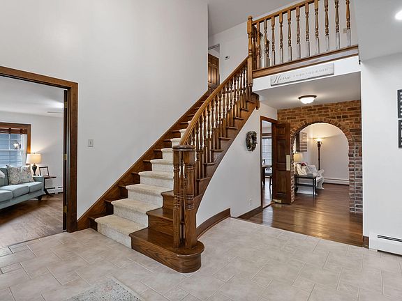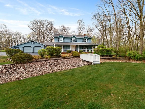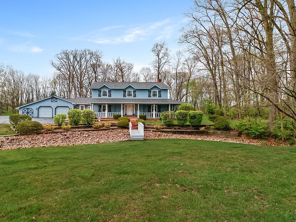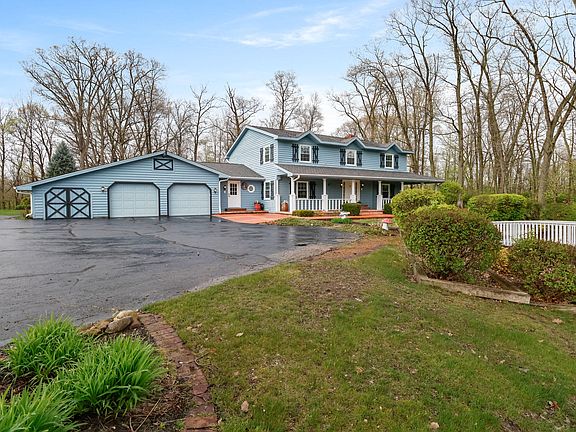 Luxury awaits in this delightful two-story home nestled on 1.49 acres of land, boasting 3705 square feet, clever storage space, a large driveway, 2.5 car garage, four bedrooms, two full baths, one half bath, and a 3/4 bath. This property offers a plethora of updates and enticing features, including: vintage custom Amish cabinetry with Corian countertops, double oven, and built-in brick wine rack in the kitchen with open concept dining room space, a gas fireplace, with a sliding glass door leading to the back deck for ambience. Upon entry you will be greeted by a spectacular staircase and brick arch entryway leading into the large living room with a beautiful brick wood burning fireplace with a gas option available. This home also has a bonus room currently being utilized as a game room , French doors leading to the master suite with a walk-in closet, Whirlpool tub and double vanity sink in the master en-suite bathroom. The upstairs bedrooms include a Jack and Jill bathroom, each equipped with its own vanity and walk-in closet. Front and back yard have a sprinkler system with an invisible underground fence and a two-tier deck with a pergola in the backyard located in a cul-de-sac offering privacy and charm for a delightful living experience. New windows were installed in 2017, new boiler, expansion tank, and water heater 2021, new sump pump 2023. Bought water softener in 2023. The A/C unit for downstairs was also new and installed in 2020 and comes with a 10yr warranty. Well & septic inspections were done in 2023 and the septic tank was pumped. Get ready to embrace the warmth and charm of this move-in ready home featuring a charming wrap-around porch just in time for the spring and summer seasons!