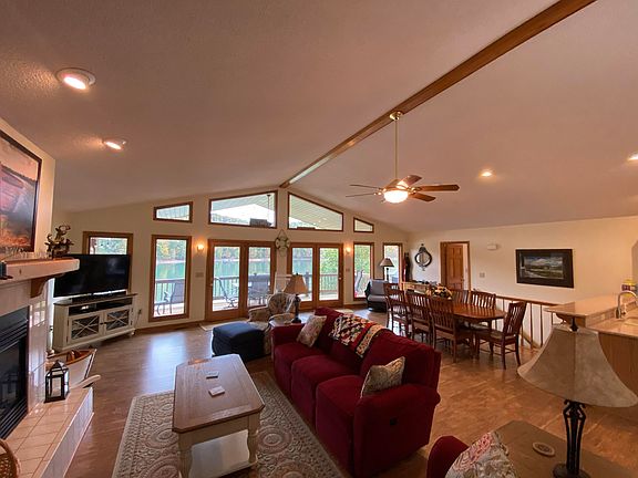 Lakefront... easy access to the water... built as close to the lake as is allowed. This is the most popular floorplan at Deerfield with four master suites. Enter on the main level with kitchen, dining area, large living area and half bath. Each side of this living space is flanked by a master suite on each side. Downstairs is another large family room, laundry, and again... master suites on each side. New roof in 2020. The dock is one bay uncovered, but could be modified to have a roof. The home is permitted for a two bay covered dock. Please note that Deerfield doesn't have an HOA, but is under developer control. Yearly dues for resort maintenance & security is a $500 fee.