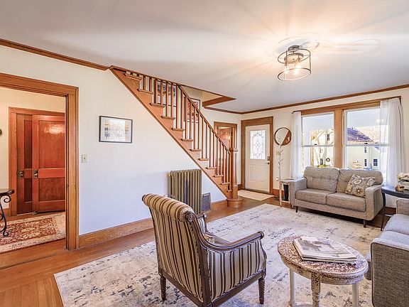 Handsome Arts & Crafts era home with much classic charm, period details, and many recent renovations. Floor plan is open and spacious with large rooms, tall ceilings and good flow--ideal for comfortable and functional living. Large living & family rooms connect seamlessly with the tastefully renovated kitchen with sleek white Corian countertops, apron sink, subway tile backsplash, stainless appliances, and cute eat-in dining nook. Lots of light too with views to the back yard and deck. Formal dining room offers ample entertaining space for family gatherings. A cozy sun room area adjacent provides a quiet and pleasant gathering spot. 1st floor bedroom is bright and sunny and is next to a newly renovated bath with tile, clawfoot tub, and stone vanity top. Front and rear stairwells provide access to 3 upstairs bedrooms and office--all well proportioned and with large windows allowing bright light to filter in. Full bath upstairs features tasteful tile floors, marble-topped double vanity, and custom glass shower. This home has it all. But wait, there's more. A partially finished basement area offers unbelievable potential for additional living, workshop, fitness or creative spaces. With a 1 acre lot size, there is plenty of yard space for garden or play. A newly fenced in yard area is perfect for pets and children. Within an easy stroll of downtown Warren village, with access to the St. George River, a local cafe, town park, and library, this location is the best of all worlds.