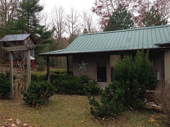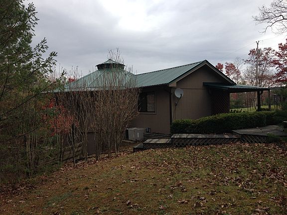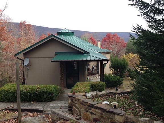 This is a unique home settled at the top of Pinnacle Lane. The house itself is round in structure. The upstairs features a sun room that functions as a bedroom, a kitchen and living area, a master bedroom and en suite. The downstairs features a full washer/dryer area, a full bath, and bedroom with built in shelves and closet. It also has another room that could be a second den or bedroom. The lot features peach and apple trees, three outbuildings and a large barn with greenhouse and stalls for livestock. The barn also has a secondary kitchen and pantry. Further down the lot, there is space for chickens and/or goats to be corralled. There is a small pond on the property and at the base of the road, the creek runs through with native trout. The woods around are ideal for hunting.