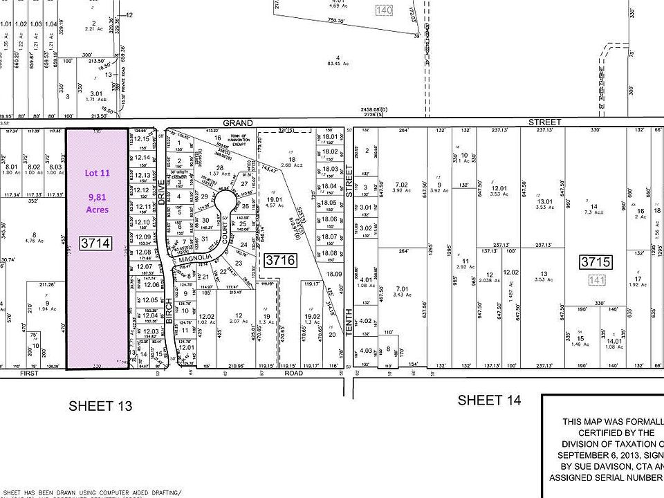 Pro Builder's Alert. Rare opportunity in Hammonton. 9.81 Acres with public water and sewer. The property is located in the R-3 Zone. R-3 allows for 1 house per 25,000 sq ft, also it allows for twin units per 37,500 sq ft. This property is adjacent to the Tim Schaeffer development "Woodbridge" which was a wildly successful development. This lot has many of the same characteristics as Woodbridge. There is access and frontage on both Grand Street and 1st Road. The frontage on both roadways are 330' respectively. The length of the property is 1,295' (its a perfect rectangle). A ballpark estimate of how many possible lots (this is inclusive of 50' conceptual down the middle of the lot roadway), would be 14 to 16 houses or 16 to 18 twin units. These are estimates only! There are two houses on the lot, both close to 1st Road. The house to the rear is a likely tear-down. The house closer to the road is likely salvageable however its in poor condition. There are also 3 trailer bodies on the property. Entry into the houses is strictly prohibited unless the buyer prospect signs a hold harmless agreement prior to entry. Please contact Joe Wiessner Realty for the hold harmless agreement. Entry to the three trailers are strictly prohibited. All outbuildings are sold strictly as is. All engineering work and approvals (Local, State, and Federal) shall be the responsibility of the Buyer, at the Buyers sole cost and expense. Closing to occur once a zoning permit is attained. Parcels like this are rare indeed. Call to today to stake your claim.