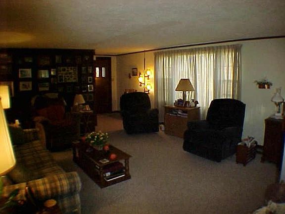 Good investment for proposed I69 exit area. Darling ranch over full fin bsmt on one ac with woods-situated on a hill overlooking countryside. Cute Kt w/blt-in corner booth overlooks wded back & side yd & cov patio. Form al DR w/wd burn frplc. Knotty pine walls in several areas. Hdwd flrs under carpet. Bsmt has FR w/wd burn frplc, lg laundry rm, lg storage rm w/sauna & shower. Private BR in bsmt would be great for teens. One yr home warr , oversz 1c gar, septic '02/well '04.