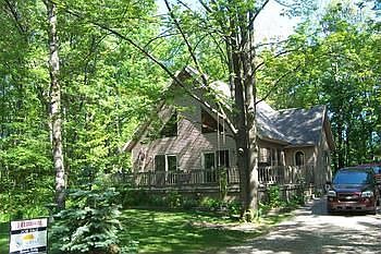 This Chalet home is nestled in a wooded area within steps from a deeded sandy beach easement. Open floor plan with beautiful yellow pine floors from Georgia, 22 ft. vaulted pine ceiling, 1st floor laundry. Two sets of doorwalls off of dining and great room lead out to wrap-around deck. Call for more details.
