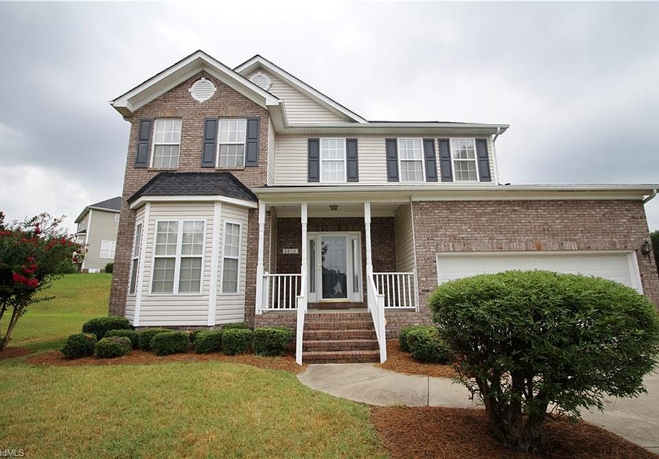 HIGH POINT 3BR 2.5 bath brick and vinyl home in Mill Pointe! Spacious great room with vaulted ceiling, fireplace with gas logs. Large dining area with bay windows. Kitchen opens up to breakfast area with french doors to rear deck. Office on main level. Downstairs has molding and wainscoting in dining area, plus lots of beautiful hardwood flooring. Master suite has lots of closet space, bath with garden tub and separate shower.