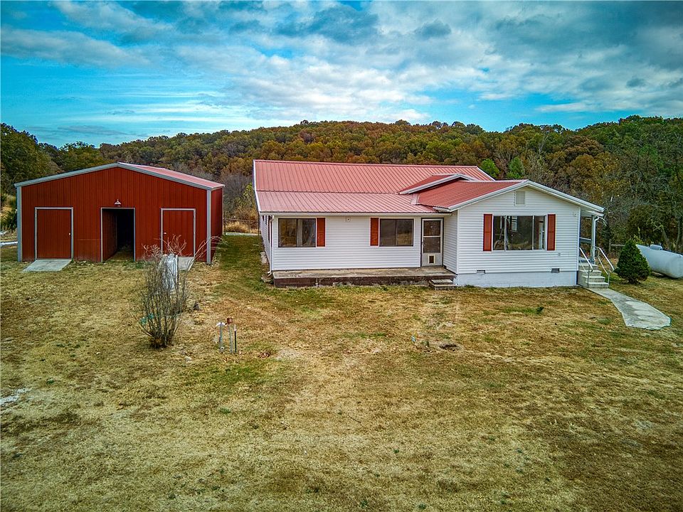 Buyers Choice: with an acceptable offer, Sellers will give Buyers $20K to go towards a price reduction, credit at closing, closing costs and/or a rate buy down. This 19 m/l acre farm is nestled in the heart of the Ozarks offering endless opportunities for country living. This property has a new roof, new siding, new flooring, paint and new HVAC. It features 3 or 4 BR, 2 BA and has a walkout, unfinished basement with a storm shelter and a convenient one-car attached garage. The property is on a private well with the option to connect to city water, has a large pond and 2 creeks (one wet weather, one seasonal). The farm has impressive outbuildings, including a 3-car, metal with concrete slab detached garage workshop measuring 27.5 x 39 with its own electric meter and a second large metal multi-stall workshop building. Hay storage structures, multiple water spigots, fruit bearing trees - 12 of them! The land is fully fenced and cross-fenced. The chicken house nearby is NOT in operation. It is used for hay storage.