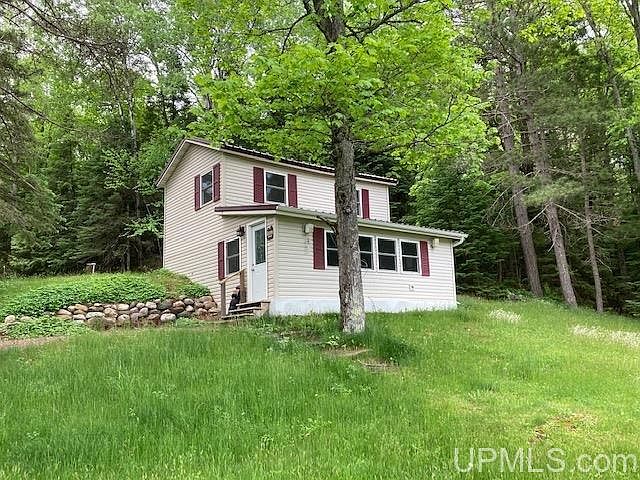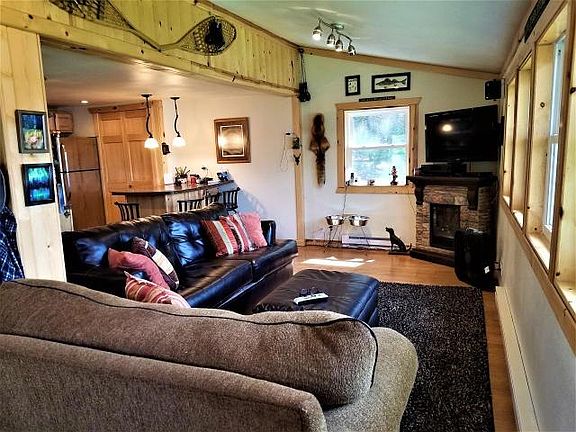 RIPPLING WATERS! This updated cozy four season home offers an open concept living area with newer hickory cabinets including a pantry, a handy snack bar plus stainless steel appliances. The multiple windows, facing the water, offer a panoramic view of the picturesque lake. The walls are newer drywall with some tongue and groove accent areas; the ceiling is partially vaulted and the corner electric fireplace will take the chill off on those cool fall nights. Laminate floors throughout make cleaning a breeze. The bath, with a shower stall and vanity, is also newer with a hidden spot for a stack washer/dryer. Upstairs are two bedrooms with lake views. The beach area is level with an L shaped dock and firepit, perfect for making s'mores. Maintenance free vinyl siding plus a metal roof complete the package. Come live the dream of having your own lake home!