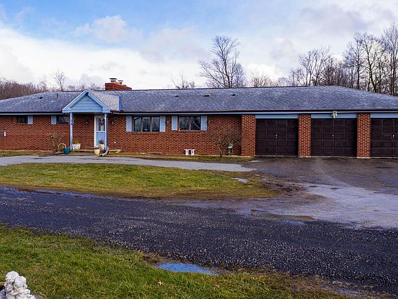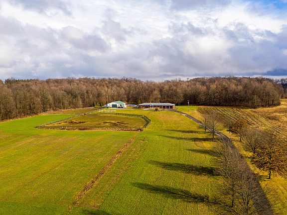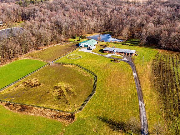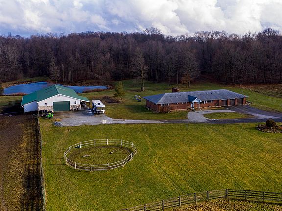 Don't miss this opportunity to own this 24+ acre horse farm! Back a long drive sits this sprawling brick ranch that offers large eat-in kitchen w/ cherry cabinets, formal dining rm, spacious family room w/ see through fireplace into the den/rec rm or 3rd bedroom. Master BR offers large walk-in closet and full BA. Wood floors throughout. Full basement offers finished living space for add'l living room or more bedrooms. Half bath, plus tons of storage space. Outside you will find fenced pastures, hay field, outdoor riding area, & 40x66 Block Barn w/ 6 stalls, tack rm, water, electric, storage space, and front & rear overhang. 1+ acre pond is stocked w/ fish. 11+ acres of woods w/ walking/riding paths. Lots of privacy here! Many updates to the home. Natural gas. EZ access to I-71/SR 61.