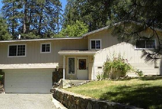 Wonderful custom home nestled in Royal Oaks subdivision. Conveniently located to Oakhurst, walk to local stores and restaurants. Nice living room with wood beam vaulted ceilings with rock fireplace. Large picture window to see nature, trees and mountains. Compact kitchen with smaller dining area or office space. Two bedroom and two baths. Master has two clothes closets and built ins. Master bedroom has an exterior door to access your wonderful covered deck with local mountain setting views. Home has had windows replaced with newer double pane (except large picture window& 2 above it and ones above front door), newer heating and A/C units. 20 year roof done in 2006, new septic lines and septic tank inspected & pumped in 2008. Reverse osmosis installed under kitchen sink for cooking & drinking. Lots of storage area. Two car garage with shop area. Great assortment of trees and nice walkway of stone and cement to front door. This would be a terrific first time home buyer or 2nd home get