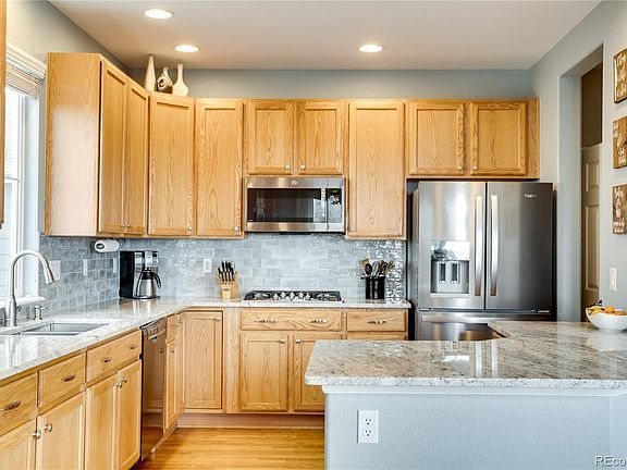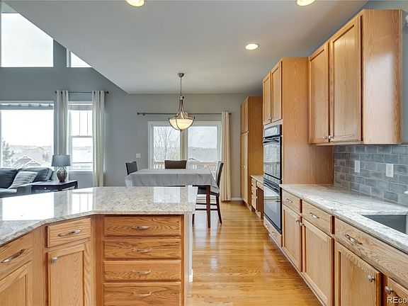 A stunning and lovingly maintained home dressed with craftsman-style curb appeal and panoramic views of the entire Front Range. Curated with oversized door frames, arched doorways and upgrades throughout, the interior shines with a main-floor bedroom/office, pass-through fireplace shared by dining and living rooms, and an eat-in kitchen trimmed with granite counters, GE Profile 5-burner gas range, built-in desk and counter-height seating. From the kitchen is access to both the dining room via a well-appointed wet bar and to an exterior deck composed of Trex material. A mud room features built-in storage and cubbies; plus, access to the 3-car garage. Four bedrooms, including a master suite, fill the second-floor. Marked by a double-door entry, the master is framed by vaulted ceilings and brilliant mountain views, while the ensuite boasts tile floors and shower-surround, a double-vanity, private water closet and jetted soaker tub. Among the bedrooms is a built-in desk for two overlooking the living room below, a hallway linen closet and full-bath with tile floors, a double-vanity, tile shower-surround and private water closet. A utility sink and cabinets add to the appeal of second-story laundry. An unfinished basement with an abundance of windows provides seamless access to the backyard paradise with a stamped concrete patio, raised garden beds and a play set surrounded by sand. Located within Cherry Creek School District with walking distance to local elementary; close proximity to Sky Vista Middle School. Quick access to C-470, Cherry Creek Park and Lake.