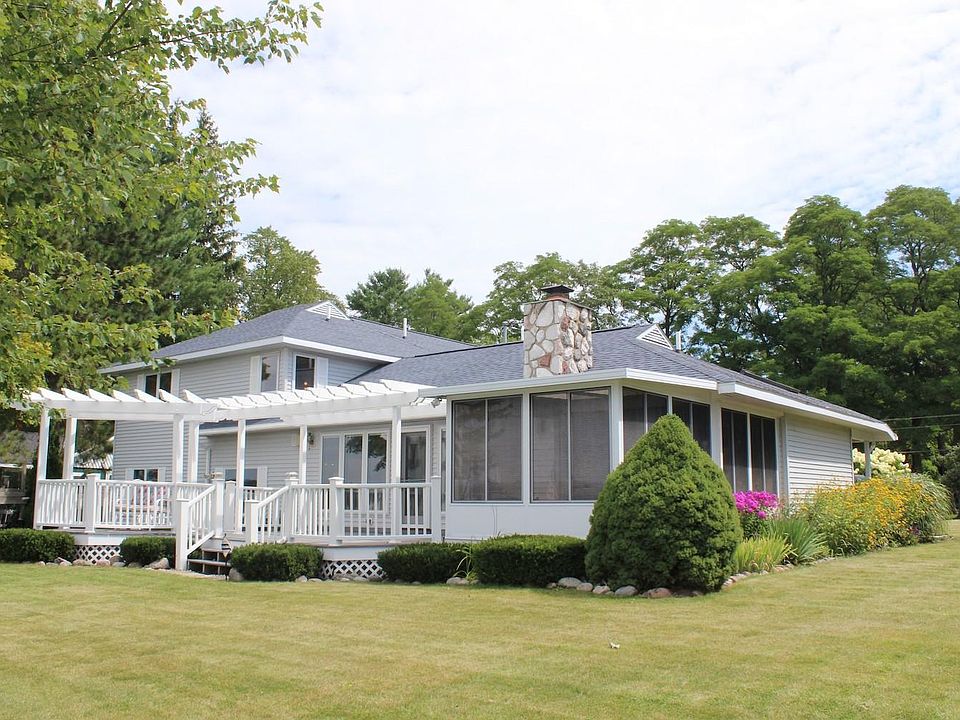 Watch beautiful sunsets from this wonderful home on 101' of sandy eastern shoreline of Otsego Lake! Located in the famed Buck Road neighborhood, enjoy the serene landscaping including a flower garden filled with unique rocks from all over the Great Lakes and Florida. Inside there is plenty of room with 4 bedrooms and 2 master suites and separate office space. Large kitchen with breakfast bar and a large living area with a fieldstone fireplace. Serene 3-season porch that opens out to a large composite lakeside deck. Two car insulated garage with a large bonus workshop. Extras include a large garden shed, dock, gorgeous wooden bear statue. Immediate occupancy!