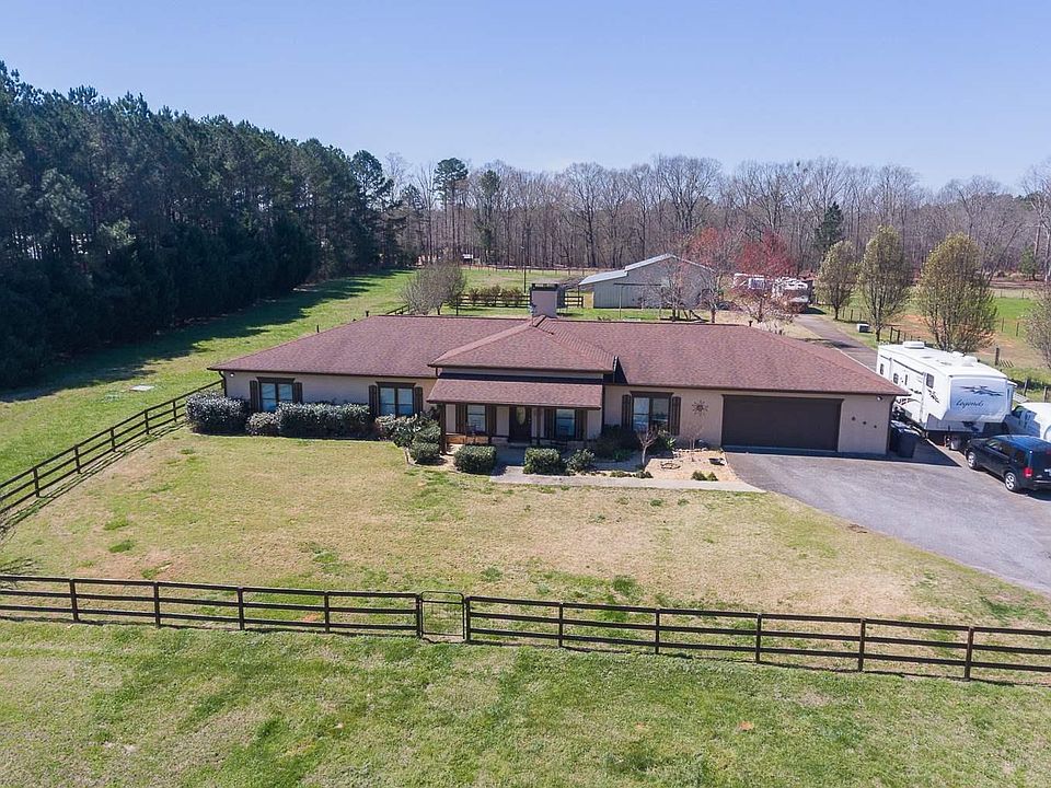 Large custom-built one level home on 5 fenced acres! The home opens to an expansive living room with a tongue and groove ceiling and stone fireplace in the middle that separates the living room from a small sitting area that overlooks the back patio and beautiful gunite pool. Just off of the living room is an oversized kitchen with tons of wrap around counter space and a large island. The kitchen also opens to the dining room providing plenty of room for entertaining! The laundry room is located just off of the kitchen along with an additional room that's currently used for a home office. The master bedroom and two additional bedrooms are located just down the hall from the living room. The master suite features hardwood floors with sliding glass doors that