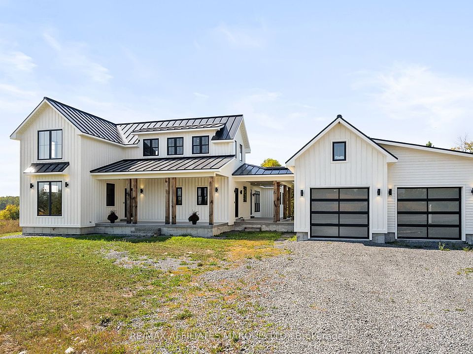Welcome to this modern farmhouse on a private one-acre lot just outside Apple Hill. Designed with timeless style and modern convenience, this home features premium finishes, advanced systems, and versatile living spaces.The exterior showcases a heritage metal roof, Cape Cod siding, natural soffits, and over 100 black-framed windows. Covered porches create inviting outdoor spaces and complete the farmhouse charm.Inside, soaring ceilings and European white oak floors set the tone. The gourmet kitchen includes marble countertops, custom cabinetry, a professional six-burner stove, oversized fridge, and island with refrigerated drawers. The great room features vaulted ceilings and custom shiplap details.The main-floor primary suite offers a spa-like retreat with heated floors, soaker tub, walk-in shower, and dressing room. Upstairs, two bedrooms with their own bathroom to share. The finished basement adds flexible space for a media room, recreation, or additional bedroom, with a rough-in for a bar or kitchen. There is also a full bathroom and the potential for another bedroom in the basement - making it ideal for guests who want to visit. Additional highlights include spray foam insulation, dual-zone HVAC, a Generac backup generator, and full security system.The detached garage workshop offers extra-height ceilings, extended bays, dedicated power, and a covered portico connecting to the main home.This property combines luxury, function, and peaceful country living all just minutes from Apple Hill.