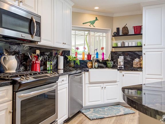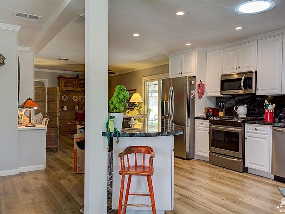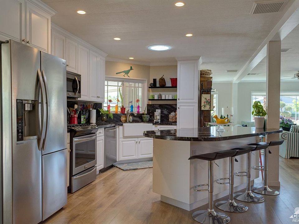 Perfect home in the Desirable gated community of Palm Desert Greens with many amenities such as the friendly Club House, community pools, Tennis, Pickle-Ball courts and LOW HOA that includes Golf! Plus you OWN the LAND! The sellers have done a fabulous job making this home like new. You will love the wide plank flooring when you enter only to be amazed at the remodeled kitchen featuring newer Frigidaire appliances. The LG refrigerator washer and dryer are also included. Look at the beautiful granite counters with full back splash surrounding the not so common very functional Farm sink. The windows and slider have been replaced with dual pane to make it more energy efficient. Did you see the crown molding? Enjoy sitting in the formal living room watching the gorgeous sunsets with Mt. San Jacinto in the back drop. The rear and side yard are also completely fenced to be pet friendly. Seller will entertain all reasonable offers!
