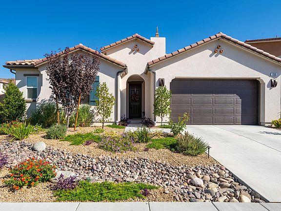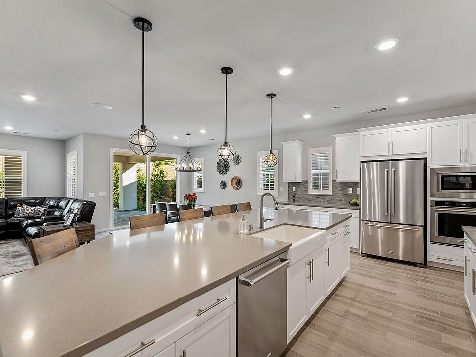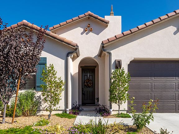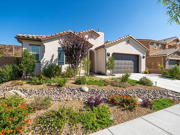 Welcome home to this practically brand new single story home in Arroyo Vista @ The Woodlands. This home was built in 2019 and the owner has spent thousands of dollars on both the upgrades and extensive hardscape and landscape. Choices of upgrades with the builder include but are not limited to: Gorgeous wood-look gray tile flooring, recessed lighting, Shaker cabinetry with soft-close drawers and under cabinet lighting, extended island, quartz countertops, glass tile backsplash, stainless steel KitchenAid appliance package, double ovens, plantation shutters, surround sound, higher ceilings and taller doors, Casablanca fans in all bedrooms and great room, touch dimmers throughout, larger soaking tubs, glass shower surrounds, quartz on shower walls, quartz on vanities with square sinks and upgraded fixtures, lighting fixtures, and shelving in garage. The list seriously is extensive! The outdoor space is an entertainer's delight on this larger corner lot. There is a waterfall, gorgeous pavers, gas firepit, tiered planters, fountain, lovely choices of drought-resistant plantings, timed drip sprinkler system, extended patio cover, and privacy gate. The frontyard features a dry riverbed and more drought-resistant plantings. Hurry, this won't last!