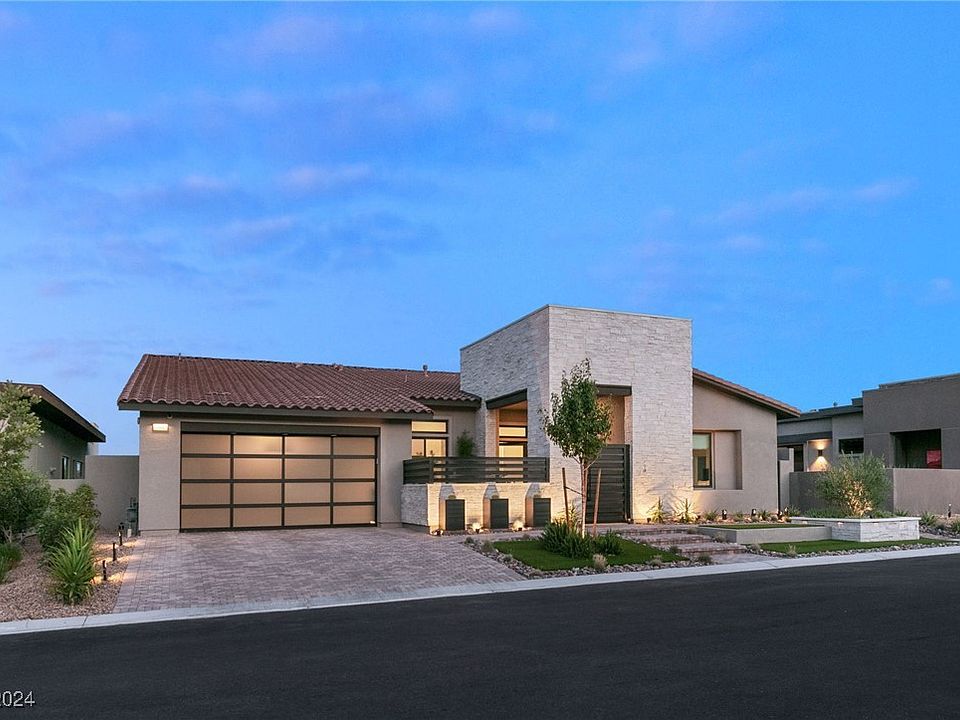 Welcome to this meticulously maintained West Summerlin showstopper, where every conceivable upgrade has been thoughtfully added. Perfectly situated w/ unobstructed views of the Las Vegas Strip & the stunning mountain range, this home offers an ideal space for both entertaining & quiet relaxation. As you enter through the iron security entrance, you'll be greeted by a grand pivot door. The interior has 24-inch high-gloss tile flooring throughout, soaring high ceilings & tremendous disappearing pocket doors that blend indoor & outdoor living seamlessly. The kitchen is a chef's dream w/ Samsung Monogram smart appliances w/ elegant gold accents, quartz countertops w/ a waterfall edge & upper cabinets extending to the ceiling. Three spacious bedrooms & a dedicated office space, ensuring ample room for family & work. The entertainer's dream backyard features a refreshing Pebble Tec pool w/ a swim deck & a huge spa.