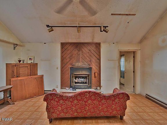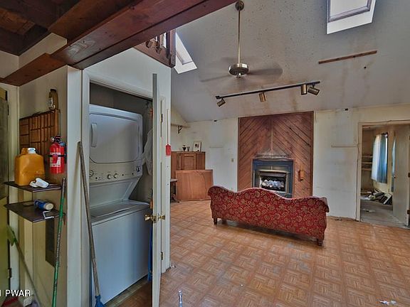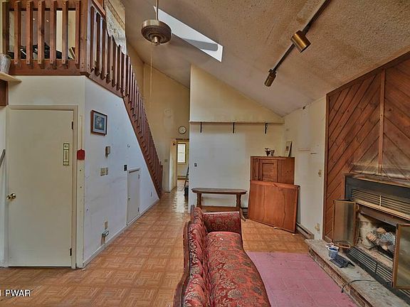 Fixer-upper in a four season amenity filled community in The Northern Poconos, just two hours from the NYC and Philadelphia Areas. This home has a lot of space, cathedral ceilings, a nice screened in porch, sheds, and is located on a private wooded lot. There are 3/4 bedrooms, 3 bathrooms. The room on the side has a separate entrance and can be used as the 4th bedroom or a family room. The upstairs has a huge room used as a master suite with a separate fireplace, and master bathroom.