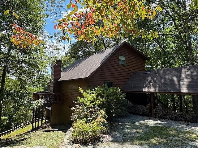 PRICE REDUCED- NEW Stain & Roof (2025) on this Cozy Cabin on 1.27 acres with creek and seasonal mountain views in gated community. Convenient location to Blue Ridge (25minutes), McCaysville (15minutes), and downtown Murphy/Casino (20 minutes)- all paved roads. Kayaking, tubing, fishing and rafting all nearby. Short term rentals allowed - sold furnished. HVAC is 6 years old. Private setting with abundant wildlife and nature. This charming cabin has an open floor plan with volume ceilings, beautiful wood trim, as well as large windows and glass doors for ample natural light. Multiple decks on both levels perfect for relaxing and taking in the beauty that surrounds you (screened and unscreened).Enjoy the sounds of the creek from your porches. The main level includes a stone wood burning fireplace and inviting kitchen with corian countertops, black appliances, small island and ample counter/cabinet space. The dining area overlooks the porches and yard. The living room area is inviting and spacious. On the main level you will also find a bedroom, full bathroom and laundry area. The upper level includes a large 2nd bedroom as well as a full bathroom. Incredible views from the upper area. The property has a carport convenient for those snowy/rainy days. Land has gentle slope and there is a fire pit area to enjoy those cool nights. The community has a clubhouse with covered picnic area, fire pit, pond as well as open land for further enjoyment. Come see this beautiful cabin perfect for short term rental, 2nd home or primary home.