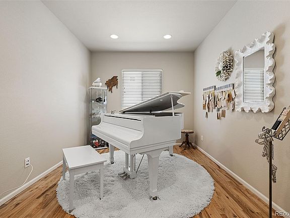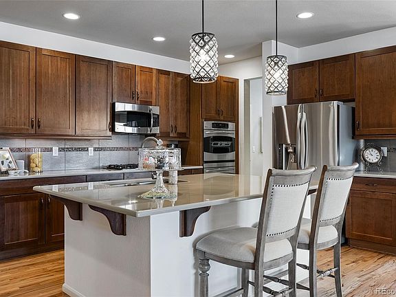 Situated on a large lot backing to a greenbelt, with gorgeous mountain views, this beautiful ranch home has so much to offer! Abundant sunlight fills each room showcasing the gorgeous hardwood flooring throughout the main level. The gourmet kitchen features beautiful 42-inch Cherry Shaker Style cabinets, Stainless Steel appliances, double ovens, custom tile back-splash, quartz counters and a large island with pendant lighting. This open floor plan offers great space for entertaining with a large family room, with gas fireplace, open to the kitchen and dining area. Relax in the Spacious Primary Suite featuring a coffered ceiling, new hardwood flooring, plantation shutters, and an en-suite bath with dual sinks, an oversized shower and a large walk-in closet. The main floor study, with French glass doors, offers a perfect work-from-home space. The finished basement offers an expansive Recreational room/Family Room, an additional bedroom, a full bath and large storage area. Watch the beautiful sunsets over the mountains from your private backyard featuring a covered patio, an extended paver patio, and professional landscaping. Within walking distance to the park and short distance to I-25, Downtown Castle Rock, shopping and restaurants. Castle Rock Living at its Finest!