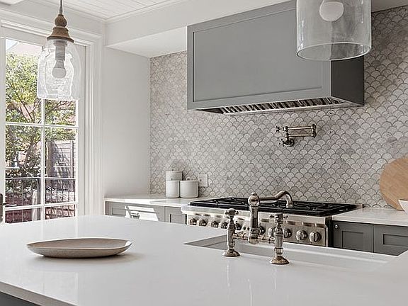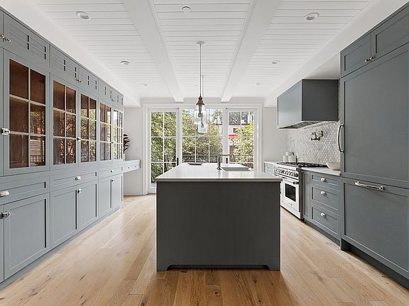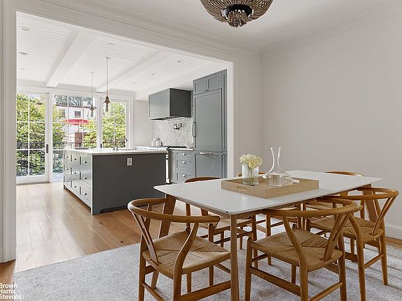Step inside at the top of the stoop and you'll be amazed by the spacious living room, adorned with beautiful moldings, a decorative fireplace mantel, and large windows that flood the room with natural light. The separate dining room offers ample space for entertaining, while the thoughtfully designed kitchen features top-of-the-line stainless steel appliances by Wolf and Bosch, gray shaker-style cabinetry, and exquisite white Silestone quartz countertops.
