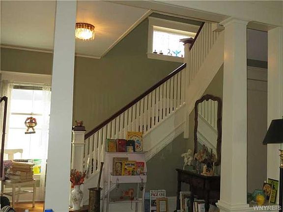 TWO covered porches,Rich leaded glass windows, hardwood floors throughout,beautiful foyer with open staircase and high ceilings are just the first of many features of this spacious Colonial home! Large kitchen, formal dining room,large living room w/pillars to open foyer and cute half bath complete first floor. Upstairs are 4 bedrooms,2 with walk in closets,full bath and walk up attic. Well maintained home has hi-eff furnace(2014),newer HWT,Central air,all appliances stay.Vinyl siding, garage,concrete driveway,some newer windows,arch. roof.