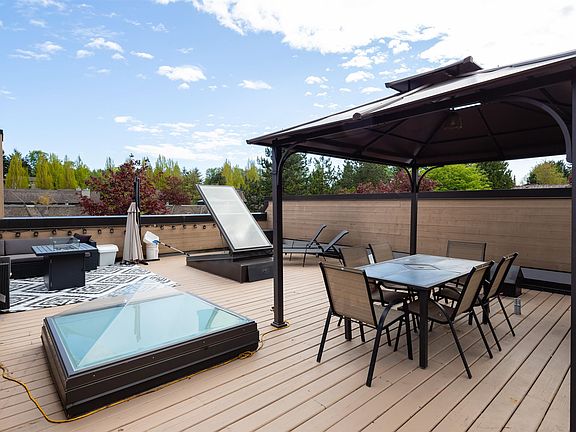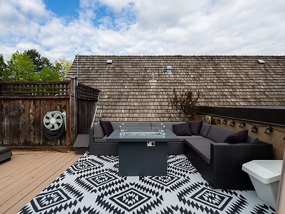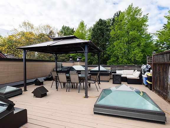 This peaceful above ground townhouse features 5 skylights and vaulted ceilings and a cozy wood-burning fireplace. 2022 renovation including gorgeous engineered hardwood flooring, new lighting, smart switches and thermostats throughout, new countertops, Riobel fixtures, heated bathroom floors - just to name a few. Must be seen to be appreciated! You'll love entertaining on your 782 sqft private roof deck, which overlooks a courtyard garden oasis. Central location, 2 side by side parking spots, large private storage room. This home won't last. Showings by appointment