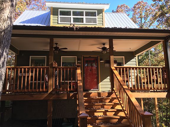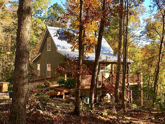 Beautiful cottage on a great setting in the woods with spectacular views. The back of the property runs to the middle of the river below. Vaulted ceilings throughout, 9 ft ceilings in the basement. Granite countertops, laminate and stone floors. Glass enclosed shower. Unique ceiling fans inside and out. A finished, large laundry room with a toilet and utility sink, cabinets and storage in the basement. Walk out basement. Side deck and back porch, large front porch. Loft for a second bedroom or office. Approx. 2 acres fenced, entry gate. 2 story detached garage. The kitchen features soft close cabinets and drawers, lighted glass upper cabinets, granite countertops with an extended counter for seating, double oven range, pendant and recessed lights, Moroccan tile backsplash, nice hood. Wide hardwood stairs to the loft with a modern cabled stair rail. Gorgeous views from the loft windows. Hardiplank exterior and metal roof. Mini splits in the living area and basement keeps you comfortable and costs down.