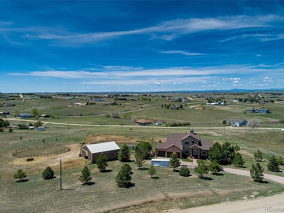 Enjoy country living and picturesque mountain range and valley views from this tranquil 5-acre horse property. Fully fenced with a five-stall barn, corral, pasture, and chicken coop. There is plenty of space for grazing several horses plus community bridle easements adjoin the property! The stunning 4 BR, 3BA home has an open floor plan. Enjoy the gorgeous views from both the inviting family room with vaulted ceiling and fireplace and the roomy kitchen with peninsula and dining nook. Spacious main floor Master En-Suite with private deck, five-piece master bath, and big walk-in closet! Three big bedrooms upstairs with a full bath, open walk-out basement, and a Trex style deck off the kitchen! Well maintained and upgraded with new triple pane windows and French doors 2018, new roof 2019, new septic 2020, new hot water heater, Pergo wood style floor, and industrial swamp cooler! Even though you are living in the country you are just 15 minutes from Southlands and E-470 for dining, shopping, and an easy commute or work from home - Great internet and phone reception! Make a move and call us today!