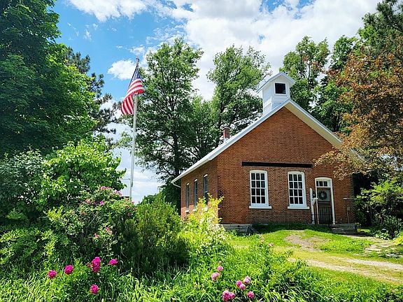 This UNIQUE, ONE OF A KIND former one-room schoolhouse has been lovingly renovated into a 1.5 story, delightful 2 bed, 1 bath home nestled on a peaceful & private setting in the country!!! This home has been meticulously & painstakingly restored w/added modern conveniences and maintained throughout. The exterior is a beautiful mix of 4 layer brick construction, freshly painted trim and brand new metal roof in 2022. The conversion of the main level has managed to retain many of its original features and classic charm & character throughout from the refinished original pine floors & wainscoting to the tall ceiling & square-paned windows that flood it with light. Spacious open-plan concept kitchen/dining & living area. Connected via metal staircase, the 2nd floor boasts two bedrooms, a full bath & added storage space. Three adorable sheds (one could be converted into a garage). Lovely, quiet yard space w/lots of shade. A MUST SEE to appreciate the history of this amazing & quaint home!!!