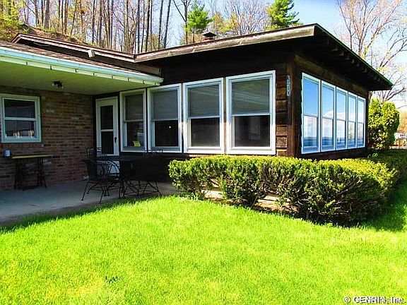 Furnished year round Seneca Lake home ready for summer of 2016! Level 200 ft lot located right at the end of Pine Road with paved parking,last house on the road, private & quiet. Wood burning stone fireplace in living room, & 2 additional wood stoves. Open living space = great views. Drive to the door home with an attached 25'x40'ft heated garage. BONUS ROOMS. Natural knotty pine woodwork throughout. Heated lakeside sunroom!! Survey complete. Permanent 25'x28' 2 bay boat hoist. Break in the seawall makes a natural boat launch on your own property. Priced under assessment. Great investment.