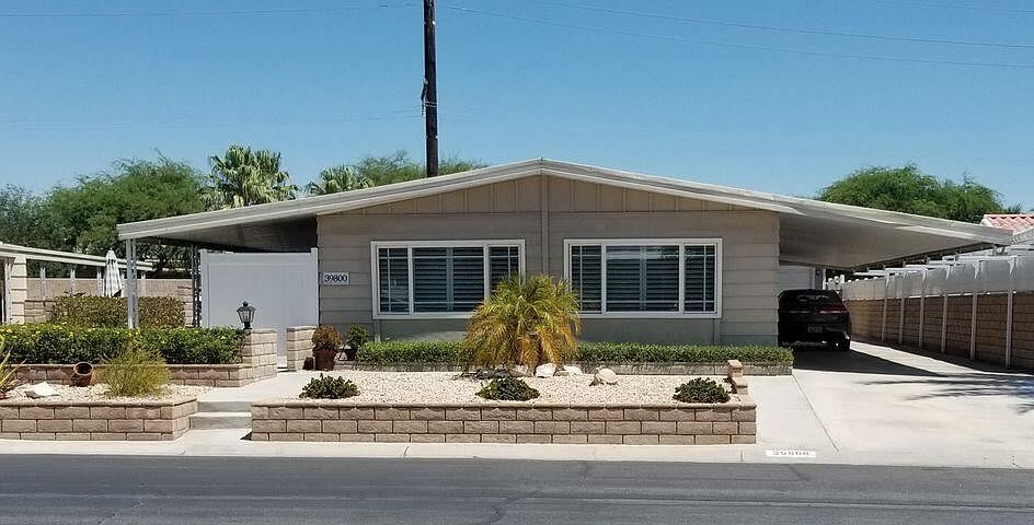 This updated 2 Bedroom / 2 Bath home boast 1760sq ft of living space and sits on a larger 5227sq ft lot. You own the land and is already on a permanent foundation for ease of financing. The open concept is perfect for today's buyer, the rooms are spacious yet offer you a sense of privacy. Gourmet kitchen has stainless-steel appliances, walk in pantry, Quartz counters, backsplash, and plenty of cabinets with pull out shelves. The family room includes an office area with built-in desk and bookshelves. Large main bedroom suite w/ walk in closet and French doors leading to a private covered patio and yard. The golf cart garage w/workbench and storage cabinets can be modified back to accommodate a car. Palm Desert Greens is one of the most sought-after 55+ community with many amenities including FREE GOLF! The low HOA $323/month also includes, cable TV/internet, trash pickup, 24/7 guard gated security, 7 tennis courts, 3 pools and spas, men and women sauna, bocce ball, indoor shuffleboard, pickle ball, fitness center, driving range, pro shop, large clubhouse with full-service restaurant and bar. It's truly the best deal in the Desert!
