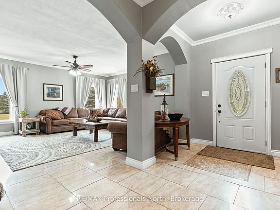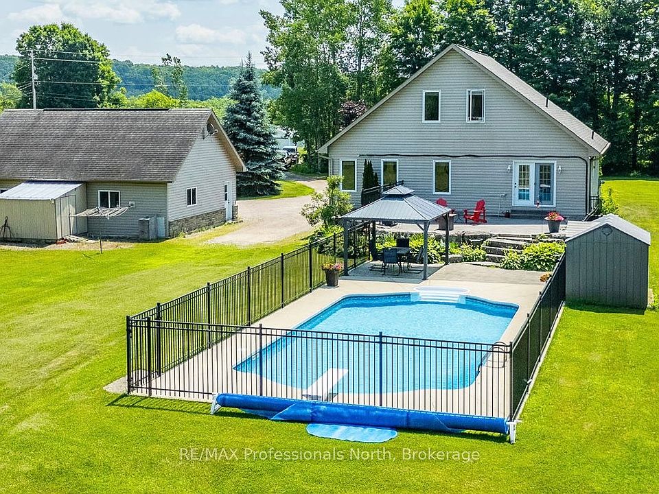 Welcome to this impressive property located just 5 minutes from downtown Minden. Set on a private 1.38-acre lot, this home offers over 2000 sq ft of finished living space, combining quality finishes, comfort & excellent indoor-outdoor flow. Inside, you'll find 9-foot ceilings, crown moulding & large windows that flood the space with natural light. Italian polished porcelain floors add a touch of sophistication, while in-floor radiant heating on both the main & lower levels provides year-round comfort. The kitchen is as functional as it is stylish with high end finishes & a bright eat-in area with garden doors that open directly to the backyard making it easy to enjoy meals outdoors or host summer gatherings. The main floor includes a spacious primary bedroom, a 2nd bedroom & a well-appointed main bathroom with soaker tub, tiled shower, & separate toilet room. Upstairs, you'll find a 3rd bedroom & a cozy den. The lower level expands your living space with a generous family/games room, bonus room, 3-piece bathroom, utility area & a convenient walkout to the driveway. Step outside to your private backyard retreat, where a stunning 18x30 inground pool takes center stage. Fully fenced in, this space is complete with a poured concrete patio, armour stone steps, a gazebo & a diving board creating the perfect blend of relaxation and recreation. Whether you're hosting guests or enjoying a quiet afternoon by the pool, this outdoor area offers a true resort-style experience. The 26x36 detached garage is ideal for extra storage & all your toys. A wide gravel driveway and established perennial gardens add both curb appeal & low-maintenance charm. Located on a year-round municipal road with public access to the Gull River just around the corner, this property offers the peace of country living with the convenience of nearby amenities. Thoughtfully finished & move-in ready, this is a home you'll be proud to own. Come discover Haliburton County's truly unique 4-season playground.