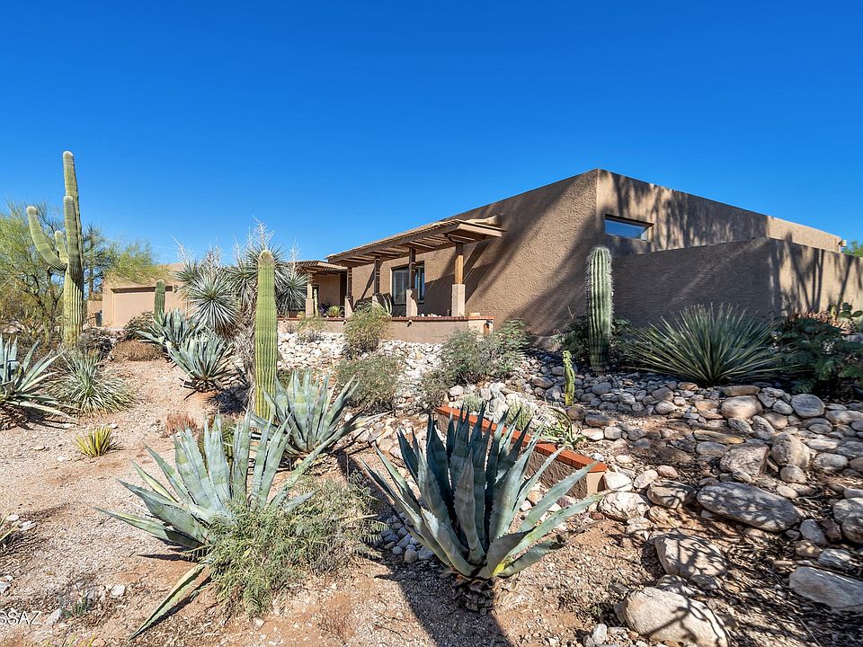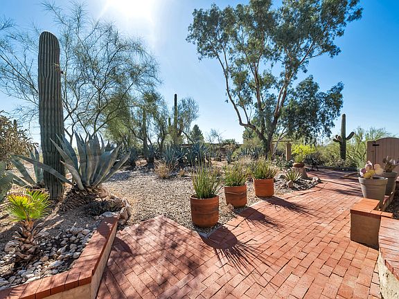 Nestled in the serene foothills, your urban hideaway awaits at the end of a peaceful cul-de-sac. This exceptional property spans approximately 1 acre and can only be described as a ''Botanical Garden'' paradise, featuring a private gully, meticulously cleared walking paths, enchanting sitting areas, ramadas, and an expansive patio. Immerse yourself in the natural beauty of this landscape, surrounded by the breathtaking desert vistas.The property is graced by the presence of striking blue agaves, elegant palo verde trees, and majestic saguaro cacti that frame the sunrise and sunset views.Inside, you'll find an open and inviting floor plan that seamlessly connects the dining, den, kitchen, and living areas. A separate wing houses the bedrooms showcasing numerous upgrades throughout. The sunken living room is a true highlight, with a large picturesque window that frames the stunning Finger Rock and Santa Catalina Mountains. Plantation shutters add a touch of elegance to every room.
