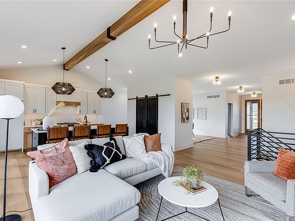 The charming front porch & 8’ double front door invite you in to this Frampton Homes stunner! You'll love the open floor plan flooded w/light from the oversized windows. A beam on the vaulted ceiling & custom FP surround add character. The kitchen features a large island, soft-close cabinetry, quartz countertops, SS appliances & walk-in pantry w/tons of storage & custom barn doors adding interest & functionality. A large 3 panel slider leads to the composite, covered deck. Custom lighting & textured backsplash add more interest! The open dining room has plenty of space for entertaining! Split bedrooms give each main floor bedroom a private feel. The primary suite incl a tray ceiling, walk-in closet w/custom organization & 5 piece bath w/comfort height dual vanity, soaker tub, stunning tile shower & water closet w/floating shelf storage. The 2nd bedroom & full bath sit at the front of the home. Custom mudroom bench adds more visual interest & separate laundry room complete the main floor. Don’t miss the 4 car garage- fully insulated, vaulted 2 stall bay w/basketball hoop, second 2 stall bay plumbed for a gas heater, 8’ insulated doors, quiet openers w/wifi & side access walk door. The walkout bsmt incl large family room, wet bar by the patio, 2 addt’l BRs, ¾ bath & TONS of storage. A whole house humidifier & dual zone HVAC add to the energy efficiency of the home w/2x6 construction & irrigation to keep your yard looking great. All info obtained from seller & public records.