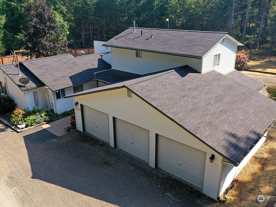 Serene wooded retreat with two primary suite-style bedrooms! One suite is upstairs, one on the main, and both are large enough to accommodate king size beds plus extra furniture. Both suites have free-standing propane stoves to stay extra cozy on chilly winter nights, and both have attached private baths. Third bedroom is on the main and shares a two-way fireplace with granite clad country kitchen. Check out how much storage this place has! Even your cars will be happy with the extra elbow room...this garage has three bays! Outside, there's a traditional yard-sized fenced area with a playset and patio. RV parking and garden space surrounded by an evergreen forest comprise the grounds surrounding the home. Don't miss this one!