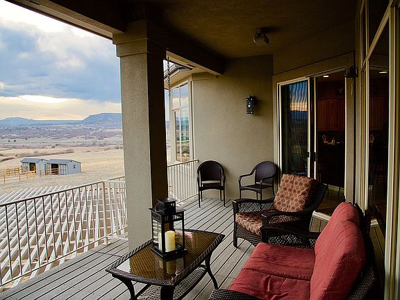 This spacious Bell Mountain Ranch residence has sweeping views of the mountains & foothills AND is one of the rare properties in this exclusive subdivision zoned for horses with over 30 miles of private equestrian trails. Main-floor living is complete with executive study, bedroom with en-suite full bath & master suite. The master suite resides under a beautiful recessed ceiling with wood floors, en-suite 5-piece bath, huge walk-in closet & private balcony. The main floor also boasts a second master type suite with walk-in closet. The open floor plan flows into the grand kitchen, with new black stainless appliances in 2018. Evenings are best spent in front of the fireplace in the great room with ledgestone surround & built-in shelving. The study is peaceful & quiet, & features glass double-door entry & built-in bookshelves & the other side of look-thru fireplace to the great room. Ledgestone surround on both sides lends rustic feel and stylish texture. Entertain in the full walk-out lower level with kitchenette and large family room full of natural light. The lower level also features 3 additional bedrooms and 2 full baths. New roof and trellis in 2019. Also, horse facilities with 2 stalls, tack room and hay storage were added in 2018.