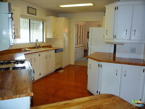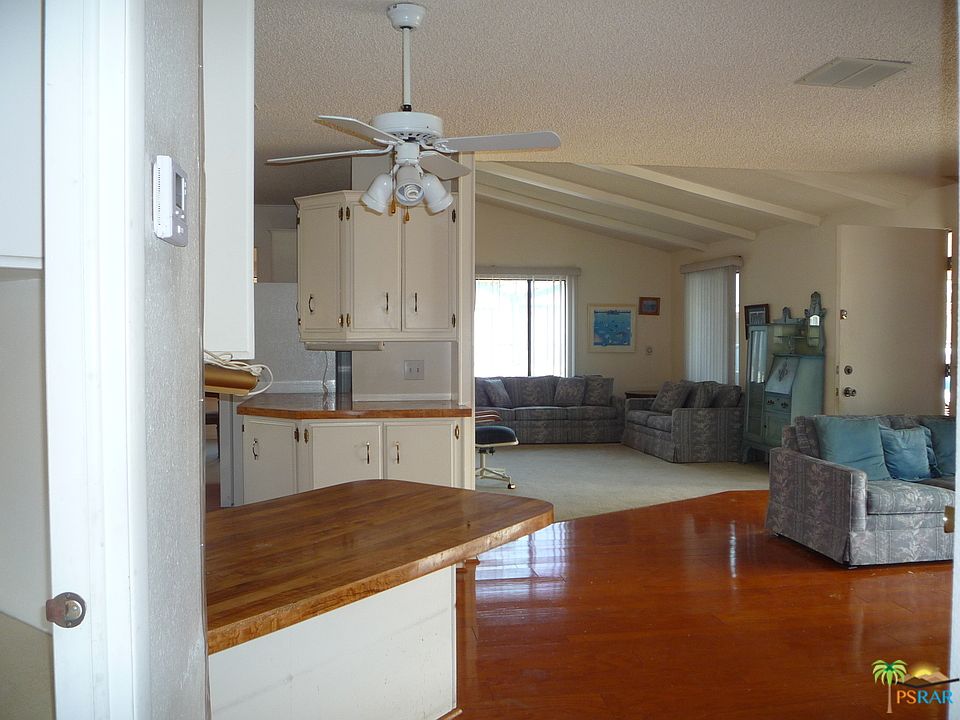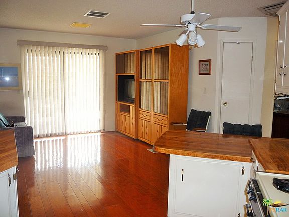 Located on a quiet cul-de-sac...this is a sweet home. Relax to lovely mountain views from the private patio. Cathedral ceilings invite you into a spacious living room open to FR and dining. This home has good natural lighting and faces west. Wood floors flow from family room into a delightful kitchen with a cute breakfast bar. You will love the generous utility room with lots of storage space. Master bedroom is large and offers plenty of closet space. Side-by-side parking makes this home easy living. Bring your paint and decorating ideas and you will have a delightful home. Palm Desert greens is a 55+ very active community. Trash and basic cable and 18 hole golf is included in HOA fee. Full-service clubhouse with bar and restaurant, 3 pools, sauna, tennis & pickle ball and many active social clubs. You can be as social as you desire. And the residents are so friendly.