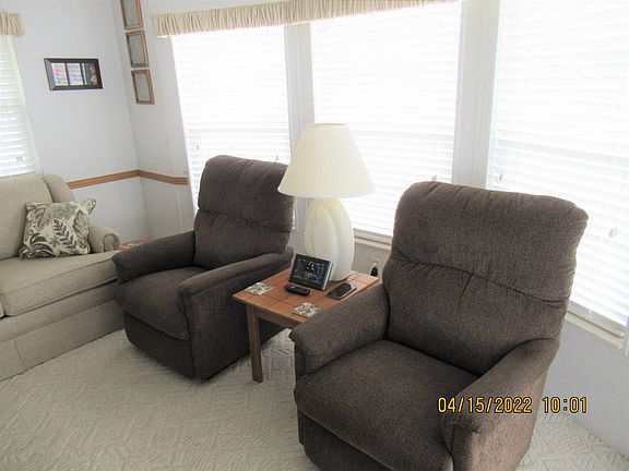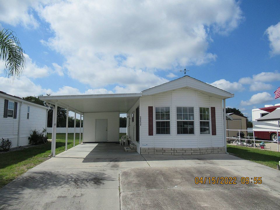 GREAT PERIMETER LOT! Perfect for watching birds. Lots of open space behind the home. This is a one bedroom, one bath, 2004, Chariot Eagle park model home with a carport and attached shed. Home is very clean and it comes fully furnished (TURN-KEY READY). This home is on LEASED LAND with a monthly lot rent of $529.00 in an active 55+ pet-friendly community in Zephyrhills. Lot rent includes trash and lawn mowing. LIVING ROOM Enter the living room through the sliding door from the carport. Very bright, spacious living room with a lighted ceiling fan, Berber-style carpet and a big bay window. Furnishings that stay include a sleeper sofa, two rocker recliners, an end table, lamp, 32" TCL flat screen TV on a stand. DINING AREA Lots of room for the table and four chairs that stay. The floor is the same carpet and there is a hanging light over the table. The built-in buffet and hutch cabinets provide wonderful storage space. Another bay window widens the table space. KITCHEN All the cabinets have real wood doors. GE Appliances include a coil-top stove, built-in microwave and a refrigerator with the freezer on top. The flooring is sheet vinyl. You can store your non-perishables in the three pantry cabinets. There is track lighting above the sink area. BEDROOM Has a built-in closet with drawers, a built-in bureau and two cabinets above the bed. The queen bed, two night stands and 22" Vizio flat screen TV remain. There is a lighted ceiling fan and Berber-style carpet on the floor. BATHROOM Full bathroom with vinyl floor, a wide corner vanity with cabinet and drawers, three linen cabinets, additional cabinets over the toilet and vanity and a walk-in shower. LAUNDRY Is located in the bathroom. The GE dryer sits on a shelf above the GE washer which is newer. EXTERIOR The home has vinyl siding and a shingle roof that is original. The Intertherm AC unit is also original but snowbirds have been living in the home for years. The windows are all double-pane glass. The home is 14' wide and the additional width is quite noticeable inside. The attached shed is 8' x 10'. It has a built-in workbench and large sturdy built-in shelves above. The carport is 14' x 29' and the driveway will hold three cars. Majestic Oaks is an active 55+ pet-friendly community. The park has a beautiful clubhouse with fitness center, billiards and library. Enjoy the heated swimming pool, shuffleboard, Bocce, horseshoes, pickleball and tennis. Shopping, restaurants, a hospital and medical offices are all close by. All listing information is deemed reliable but not guaranteed and should be independently verified through personal inspection by appropriate professionals. American Mobile Home Sales of Tampa Bay, Inc. cannot guarantee or warrant the accuracy of this information, measurements or condition of this property. Measurements are approximate. The buyer assumes full responsibility for obtaining all current rates of lot rent, fees, and pass-on costs. Additionally, the buyer is responsible for obtaining all rules, regulations, pet policies, etc., associated with the community, park, or home from the community/park manager. American Mobile Home Sales of Tampa Bay, Inc. is not responsible for quoting of said fees or policies.