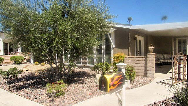 Double Garage home with mountain views by the southwest pool!!!! The home is dry walled and features Pella Windows.Laminate flooring adds to the beauty of the remodeled kitchen. Enjoy eating at the breakfast bar or dining at the table between the family room and the living room. The family room features a fireplace and a wall of windows from which you can see mountain view. The living area leads to the front patio. The large master bedroom has a bathroom suite with lots of closet space. The laundry area can be used as an office. The guest bedroom has a walk-in closet and the 2nd bath has been updated.