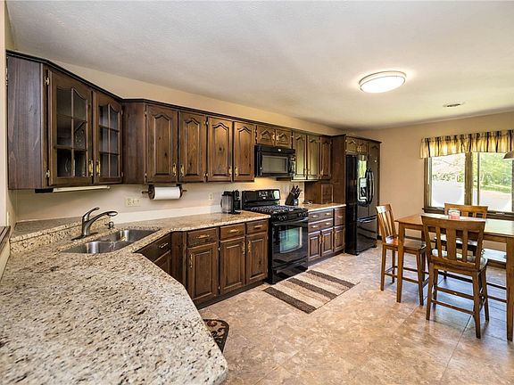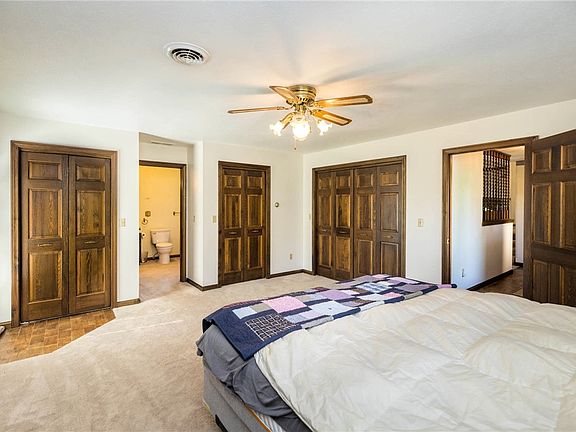 This open- concept home with cathedral ceilings has lots of room for family and entertaining- inside & outside! Kitchen has granite countertop and tiles floors. Living area has a floor to ceiling stone fireplace with Elmira insert wood stove. SO MUCH closet & storage space EVERYwhere. Basement has a large utility room, exercise area & other bonus rooms. Attached garage is heated! Detached drive- thru garage has a work bench & stove. Price improved for acreage reduction of 30 acres to 3.34 acres.