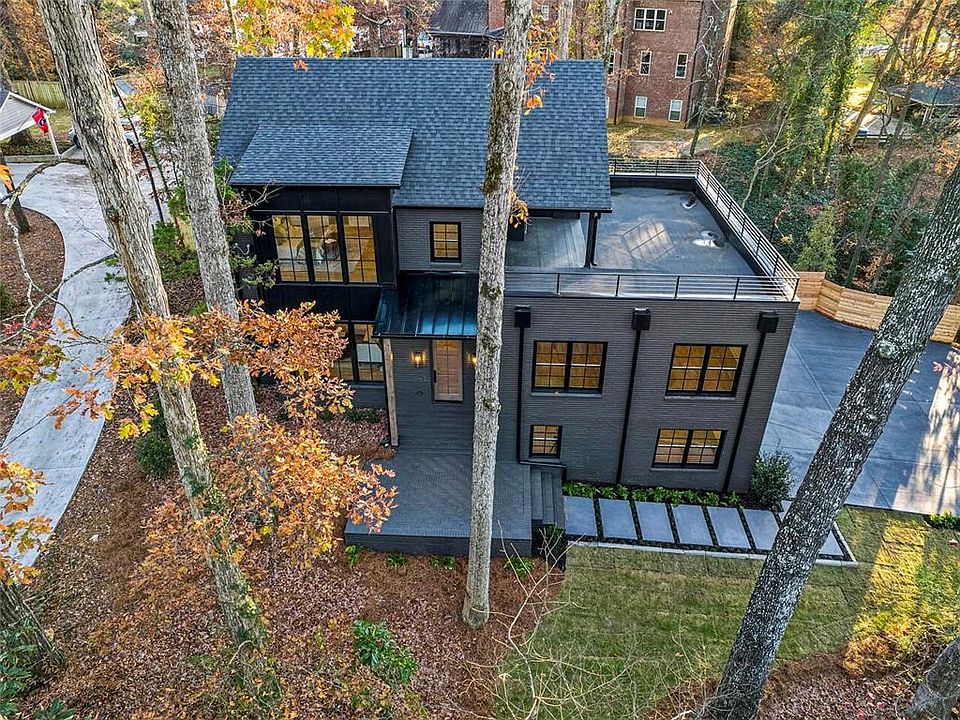 This modern masterpiece has been meticulously renovated and reimagined. Natural light, 10-foot ceilings, and warm white oak floors greet you as you enter the open-concept main level. Floor-to-ceiling custom cabinetry with walnut hardware anchor the chef’s kitchen complete with SubZero/Wolf appliances, waterfall quartz island and backsplash, and Kelly Wearstler lighting. The kitchen and open-concept dining room flow seamlessly to the landscaped and fenced backyard - a modern retreat featuring a covered porch, fireplace, and heated saltwater pool. Upstairs, the private owners' suite is a treehouse sanctuary with large windows framing views of the surrounding treetops. The ensuite bath includes heated floors, a custom walnut double vanity by Kingdom Woodworks, lighted mirrors, separate soaking tub, and an oversized walk-in closet with laundry. A versatile bonus room opens to a large rooftop terrace featuring a sleek custom iron railing and covered wet bar. Three additional bedrooms and two bathrooms featuring designer fixtures, lighting, and tile complete the upper levels. The lower level offers an additional bedroom, a dedicated laundry space, and mudroom. The two-car garage is equipped with premium epoxy flooring and an EV charging outlet. Additional unfinished encapsulated space is available for storage or potential customization, allowing flexibility to suit your needs.