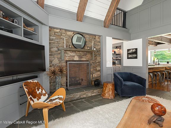 For those with creative or professional pursuits, ''Storybook Cottage'' offers a sprawling 70'x36' post and beam barn with soaring 20+ft ceilings. This expansive space includes a finished 1,369 SF artist studio with polished radiant concrete floors and steel beams, complete with a half bath that could serve a finished artist studio with polished radiant concrete floors and steel beams, complete with a half bath that could serve as an artist's studio space or a craftsperson's workshop. Above, a newly renovated 949 SF guest apartment with a large deck offers sweeping views of the grounds, providing an enticing opportunity for potential rental income or guest accommodations.