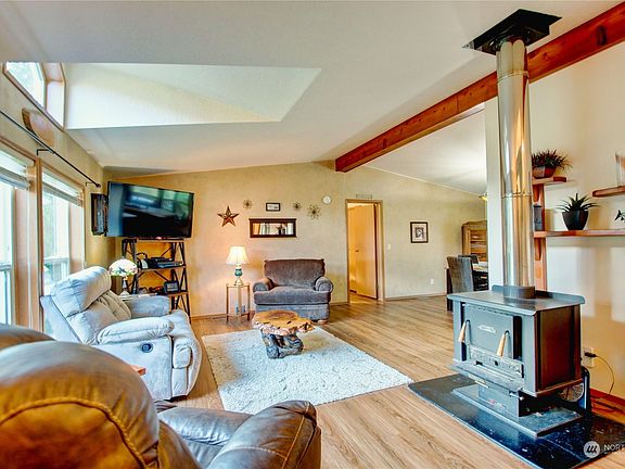 Beautiful country setting with stunning mountain views! This 3-bedroom, 2 bath home sits on 3.73 acres and is just over 1600sq ft. Primary suite w/vaulted ceilings, walk-in closet & roomy bath w/jetted tub. Large kitchen w/island next to dining room w/slider leading to covered porch. Living room has picture windows, vaulted ceilings w/wood wrapped beam & a wood stove that heats the house nicely. There are 2 addtl. bedrooms, full bath & utility rm too. Outside you will find the 46x36 3-BAY GARAGE +heated office & wood storage and the 24x24 SHOP (formerly barn) has 10x24 lean-to/wood storage area. Property borders state land & Grandy Creek on the west side & the Skagit River is about 200 yards to the south. River and boat access is nearby.