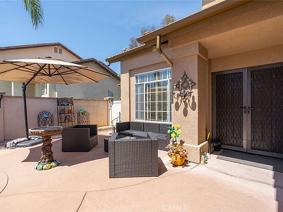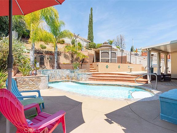 Amazing Temecula Pool Home w/ Paid Off Solar and No HOA! This beautifully maintained home features 4 bed, 2.75 bath and 2,026 square feet of living space. As you walk up the steps through a gated entryway, you will arrive in an inviting courtyard, wonderful for enjoying your morning coffee or afternoon glass of wine. You will enter the home through the double door entry and will be immediately greeted by the vaulted ceilings, hardwood and travertine tile flooring and natural light that fills the home through the many windows. The main floor features a large open-concept family room and dining area, a bedroom and a 3/4 bath. The kitchen opens directly to the living room and features granite countertops, a double oven, stainless steel appliances, under cabinet lighting, a reverse osmosis drinking water system and a kitchen island. Under the stairs you will find a truly transformed usable storage space! A small pocket door has been added as well as wood paneling and a wine glass hanging rack. This space makes a great pantry, wine cellar or coffee bar. Upstairs you will find a generously sized master suite with a large window overlooking the beautiful backyard and an en-suite bath offering a separate tub and shower, dual vanity sink and a walk-in closet. Upstairs you will also find two additional bedrooms with a Jack and Jill bathroom. Outside is a true entertainer’s dream! The aesthetically pleasing sparkling pool displays water features and has virtually all new pool equipment (replaced within the last year). There is a large covered patio with roll up shades, a gazebo with a bar/fire table, TV and a mini fridge. The backyard has been meticulously landscaped and maintained and features several trees, including apricot, lemon, lime and grapevines. All of this AND the home features a BRAND NEW 5 Ton AC unit (never even used!), a whole house water purification system and 240 volt EV charger. Located within close proximity to shopping, restaurants parks and local schools. Hurry, this is a home you won’t want to miss!