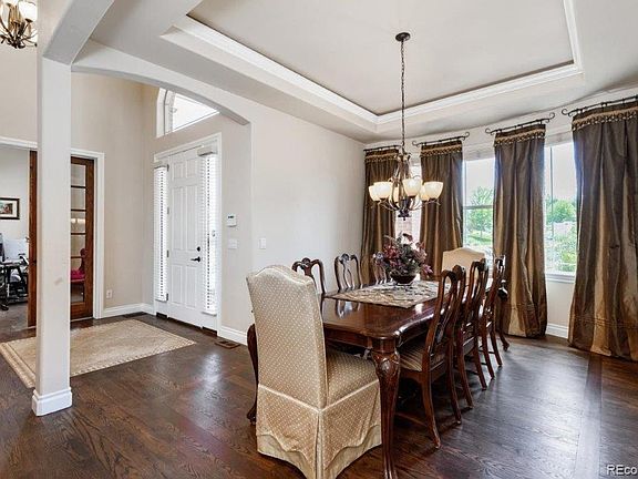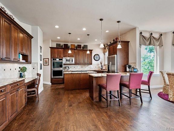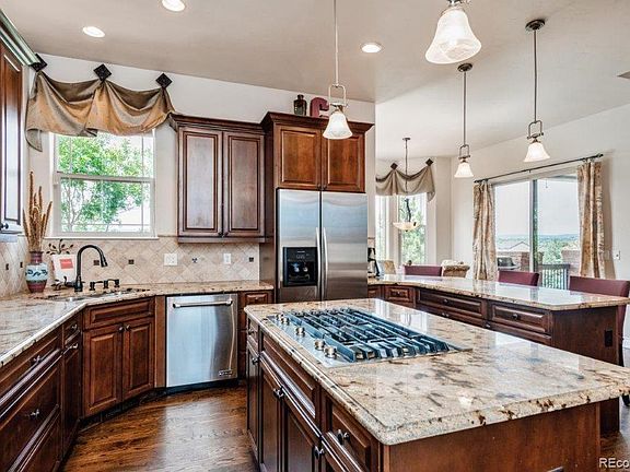Spectacular, unobstructed mountain VIEWS from this meticulously maintained home, located on a .62 acre lot, steps from Rhyolite Regional Park. No expense spared & exceptional attention given to every detail when designing this gorgeous home. Dramatic open floor plan with gleaming hardwood flooring. Sophisticated architectural accents, such as arched doorways and tray & coffered ceilings grace this home. Gourmet Dream Kitchen - stunning upgraded cabinetry, center island with 5 burner gas cooktop, granite counters, tumbled marble backsplash, breakfast bar, double ovens, pendant lighting, walk-in pantry & bay window Eating Space opens to covered deck with VIEWS. Beautiful Dining Room is complemented by a decorative pillar, tray ceiling & custom fabric window coverings. Spacious Family Room with tumbled marble surrounded gas fireplace, bookcases & 3 large windows. Convenient Study/Home Office with built-in bookcases & French doors - perfect for today's remote working. Main floor Master Suite is pure luxury. Gas fireplace + private sitting area off the huge bedroom opens to 2nd deck which is the ideal place to enjoy your morning coffee. Stunning Master Bath features dual vanities, a deep soaking tub, huge walk-in shower with 3 showerheads + bench & large walk-in closet. Elegant wood & wrought iron staircase leads you to the second level where you find 3 ensuite bedrooms. Fully finished Walk-out Basement offers has a 2nd Family Room with 3rd gas fireplace and wet bar - pool table included. Private Guest Bedroom Suite with full bath. Fabulous Outdoor Living Space - expansive stamped concrete patio with fire pit is surrounded by trees for privacy, creating a serene & enchanting setting. Invisible fence. Oversized 3 car garage - one bay has 9'11" x 9'11" door/opening and 25'8" deep, which can accommodate your recreational equipment. Ideally located steps from Rhyolite Regional Park with miles of hiking & biking trails and many other amenities. A True Colorado Treasure!