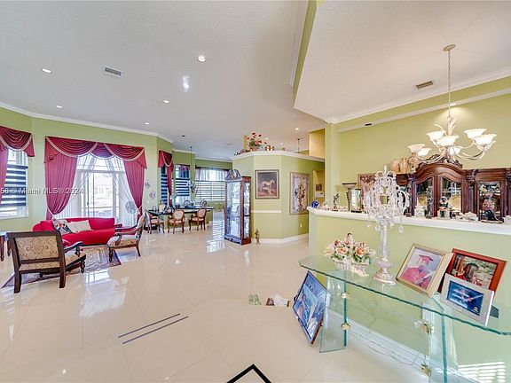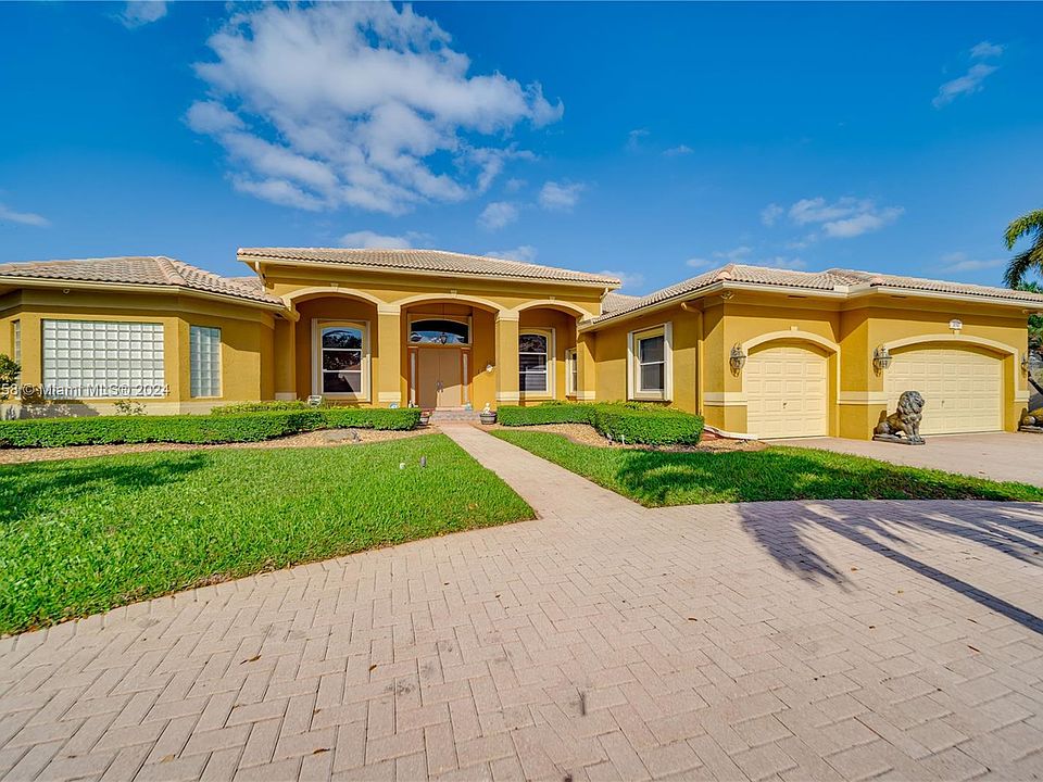 Welcome to the 24 hr Guard Gated Community of Imagination Farms. The most desirable Hanover model is 1 story expansive home w/ split floor plan w/ 15 ft ceilings, ideal for entertaining w/ large covered patio, formal dining, wet bar area, large family room and lots of windows w/ natural light on a builder's acre of tranquil Waterfront for amazing sunsets, a heated pool and plenty of yard. Granite Kitchen w/ Stainless steel Appliances, Upgraded Porcelain Tile Floors in main areas, 5th bed is an office/den , Generator, Accordion Shutters throughout, 3 zone AC unitsHOA only $150/mnth, includes parks, Basketball, picnic areas and you can rent right away. Inspection Done. Close to I-75 & excellent schools. Same model at 13963 SW 42nd st closed $1,875,000, so you have equity for renovations.