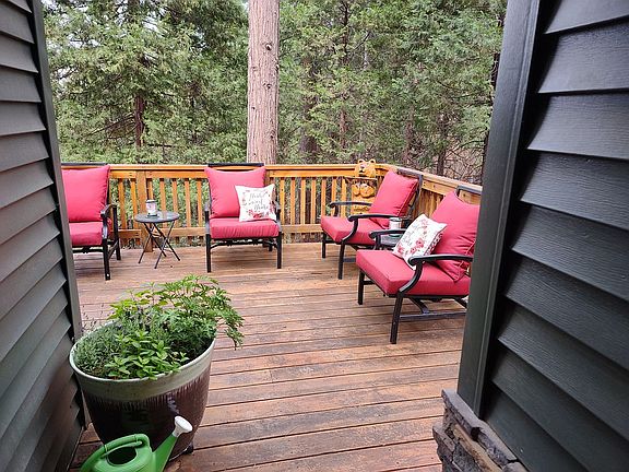 Wonderful cabin in the woods. Totally remodeled interior. Recently remodeled kitchen with gas range, new wood cabinets, granite countertops, stainless appliances, new wood look tile floors, redwood interiors all with a open floor plan and huge 2 car garage. Large deck for BBQ and entertaining. Great value!